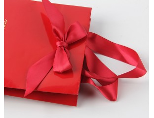 紅色在中國算是最受歡迎的顏色了,代表著喜慶、大氣,有留意的話會發(fā)現(xiàn),很多中國的珠寶商都喜歡用紅色來做珠寶的包裝、陪襯,紅色的珠寶首飾紙袋當(dāng)然也少不了。這款禮品紙袋使用雙銅紙為主要材料,袋子表面logo使用精美的燙金工藝,凸顯品牌質(zhì)感;拎手選用了絲帶,這個袋子的手拎特別有意思,不是跟其他的紙袋那樣打結(jié)或者這膠封,而是采用在外面打蝴蝶結(jié)的方式,不僅固定住了拎手,而且還裝飾了紙袋,一舉兩得。袋身由紅色專色印刷而成,做工精細(xì),印刷精美,尺寸可按需求定制。