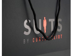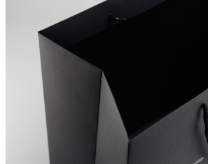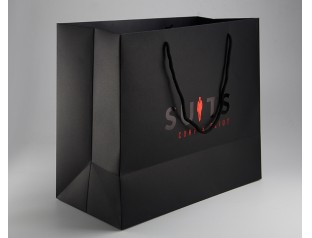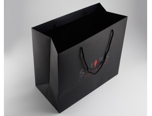 此款手提袋采用特種紙的材質,商標燙紅金和黑金,打圓孔穿黑色棉繩。