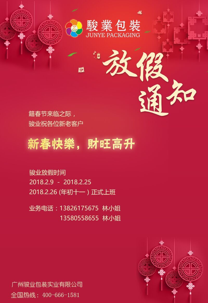 駿業(yè)包裝廠在這里提早祝各位新春快樂,闔家團(tuán)圓,丁財兩旺!