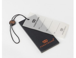 此款衣服吊牌制作采用黑卡紙,商標(biāo)燙紅金,加上一張PVC塑料片。